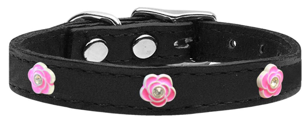 Bright Pink Rose Widget Genuine Leather Dog Collar Black 18