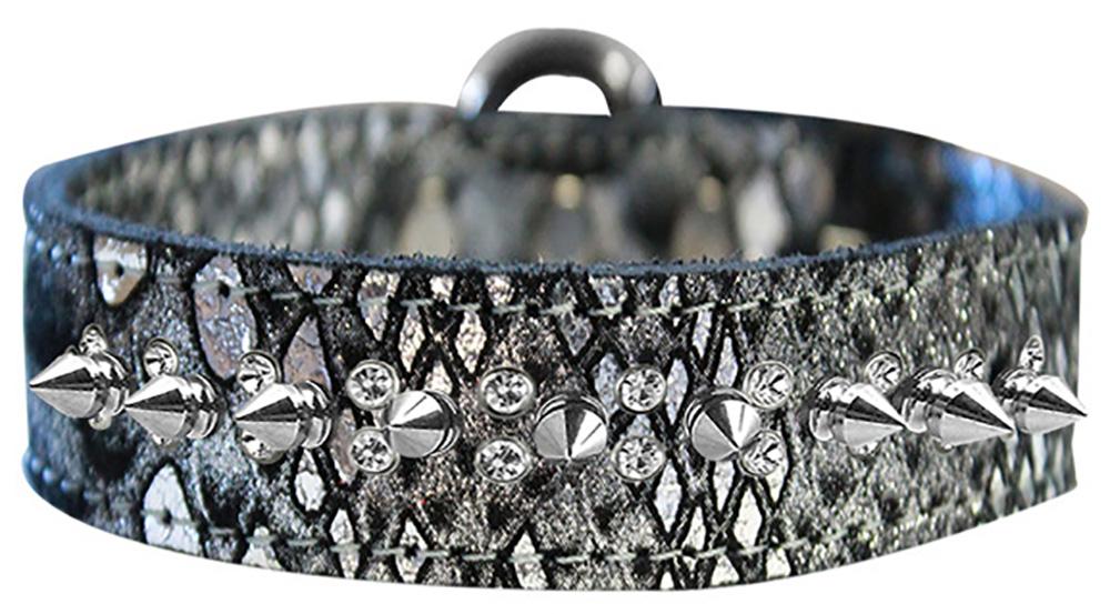Double Clear Crystal And Silver Spike Dragon Skin Genuine Leather Dog Collar Silver Size 18