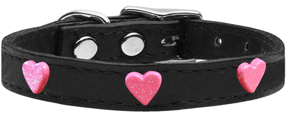 Pink Glitter Heart Widget Genuine Leather Dog Collar Black 10