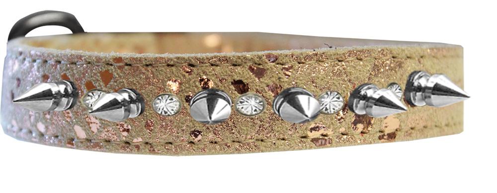 Geniune leather collar embossed with a dragon skin metallic look. Adorned with 1 row of alternating clear crystals and silver spikes. Made in the usa.