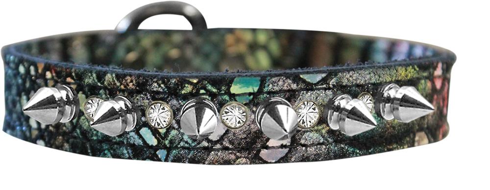 Silver Spike And Clear Crystal Dragon Skin Genuine Leather Dog Collar Magic Size 14