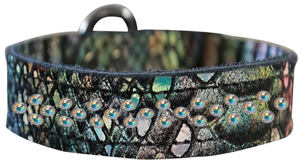 Geniune leather collar embossed with a dragon skin metallic look. Adorned in our sprinkle pattern with ab crystals. Made in the usa.