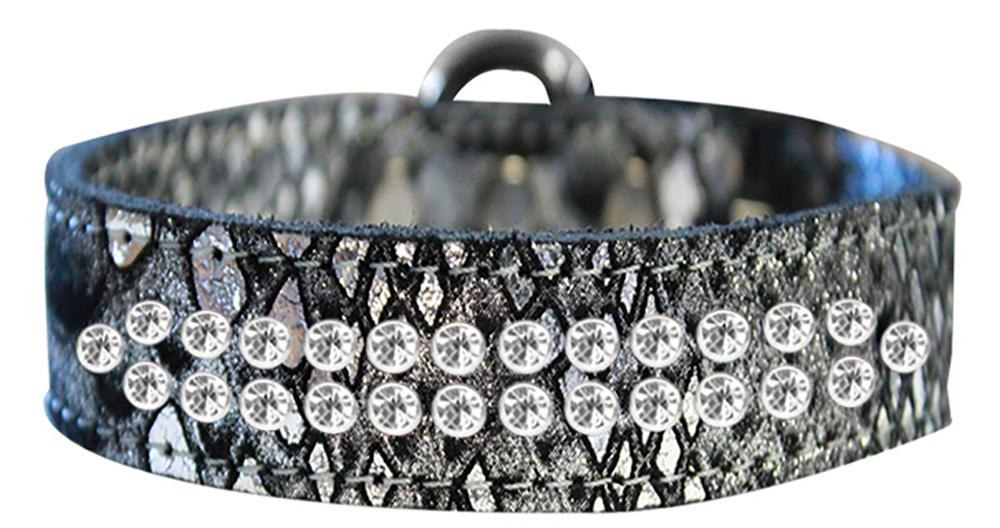 Two Row Clear Crystal Jeweled Dragon Skin Genuine Leather Dog Collar Silver Size 16