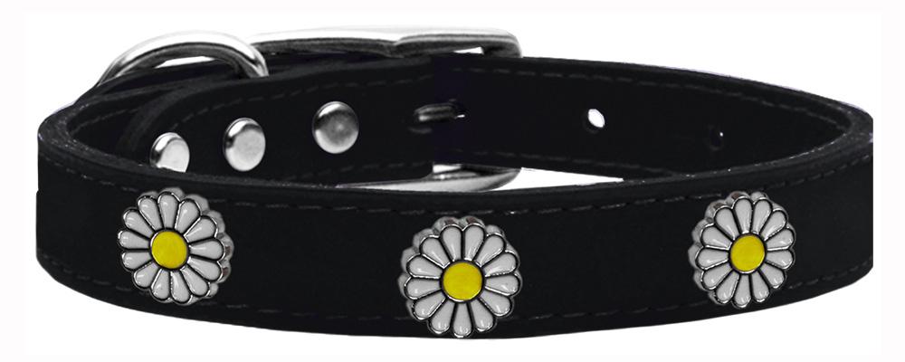 White Daisy Widget Genuine Leather Dog Collar Black 14