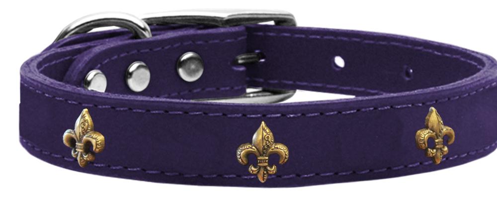 Bronze Fleur De Lis Widget Genuine Leather Dog Collar Purple 16