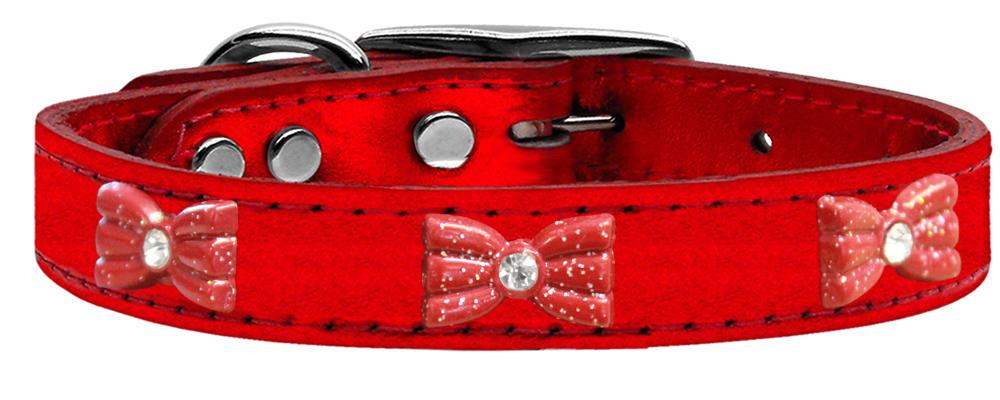Red Glitter Bow Widget Genuine Metallic Leather Dog Collar Red 20