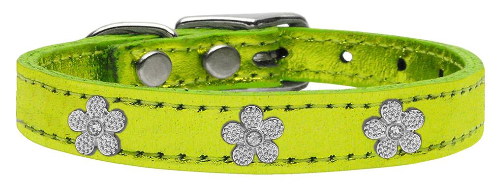 Silver Flower Widget Genuine Metallic Leather Dog Collar Lime Green 26