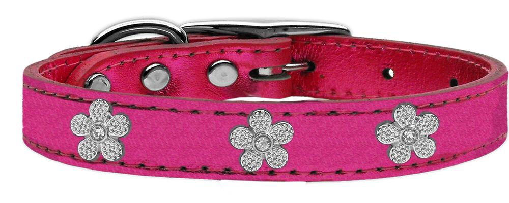 Silver Flower Widget Genuine Metallic Leather Dog Collar Pink 16