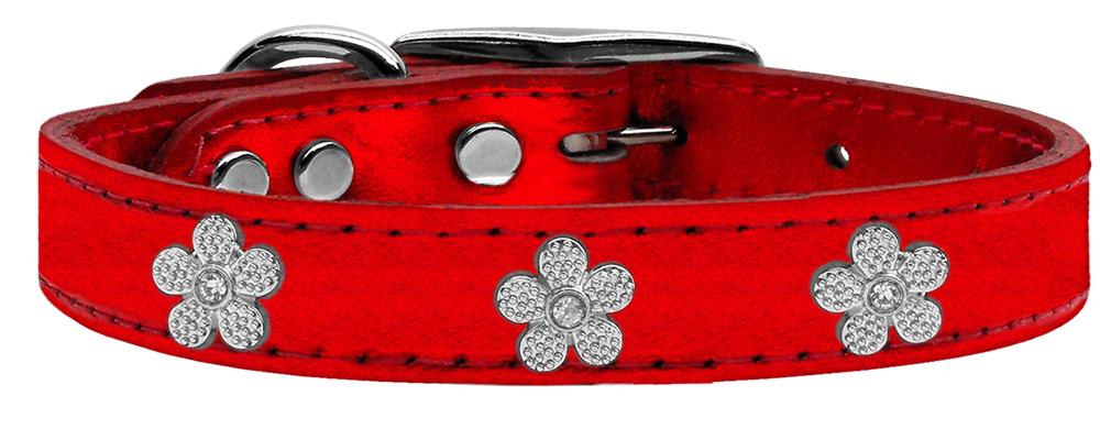Silver Flower Widget Genuine Metallic Leather Dog Collar Red 16