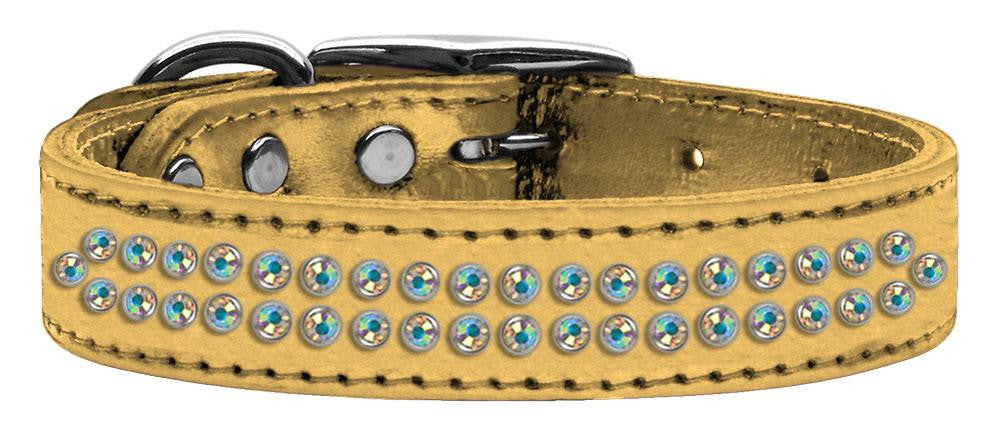 3/4" wide metallic genuine leather adorned with 2 rows of premium rim set Aurora Borealis crystals.
